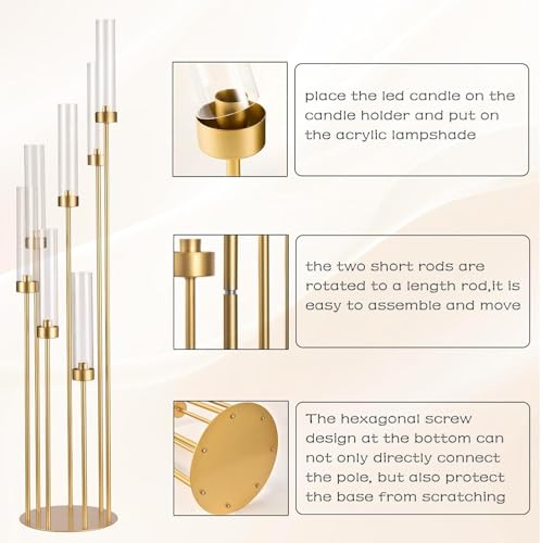 - Floor Candle Holders Tall Set: you will receive 4 sets of candelabra centerpieces with a total height of about 46.5 inches/118 cm, each of which comes with 7 detachable transparent acrylic lampshades, 9.8 inches high and 2 inches in diameter (candle not included in package); The heights of each set of 7-arm candlesticks are 13'', 16.9'', 20.9'', 24.8'', 28.7'', 32.7'' and 36.7'' respectively, which can meet the decoration needs of weddings, restaurants, parties and various scenes