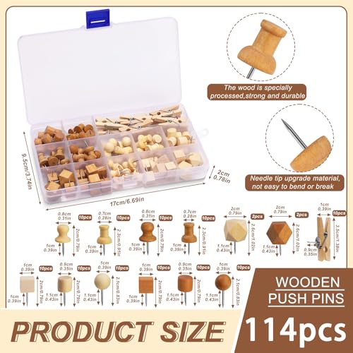 - 7 UNIQUE DESIGNS IN 1 SET: These push pins include round, cylindrical, square and other shapes and 2 natural wood colors (114pcs total). Suitable for creative notice boards