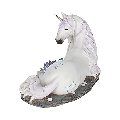 - A unicorn Reclines on a slab of rock, pink flowers scattered around him