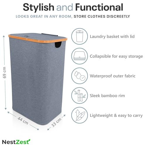 - Stylish & Discreet Design: Made with Oxford fabric and a bamboo rim, this large clothes hamper fits any room. The solid lid of this dirty clothes basket conceals laundry, keeping your space neat while blending in with modern bedroom or laundry decor.