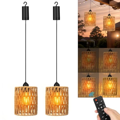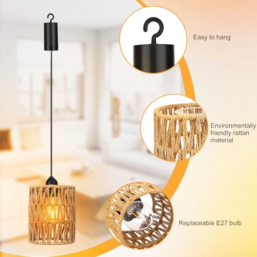 - 【Boho Rattan Lampshade】Our battery operated pendant light features a natural rattan lampshade design, which is environmentally friendly and durable, more beautiful and eye-catching. It emits soft and warm light, creating a comfortable and pleasant atmosphere, adding a touch of cozy and rustic beauty to your outdoor space.