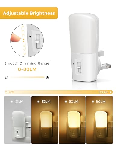 - 5-80LM Brightness Adjustable: LOHAS night light plug in wall features stepless dimming, from 5lm to 80lm with a slide switch. You can adjust the brightness of this dimmable night light according to your needs.