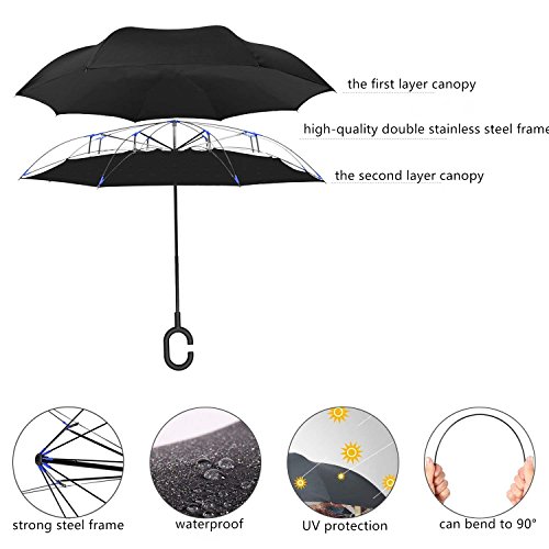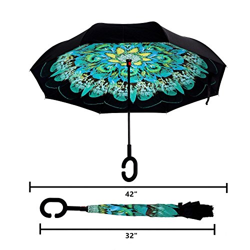 - NNY Inc Double Layer Inverted Umbrella Cars Reverse Open Folding Umbrellas, Windproof UV Protection Large Self Stand Upside Down Straight Umbrella for Golf Women and Men with C-Shaped (Peacock)
