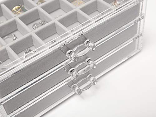 - Premium Quality Material: Acrylic Jewelry Box keeps your jewelry from dust and water. The interior flocking fabric of the jewelry box keeps your jewelry from scratches and damage. 3 drawer jewelry box measuring 9.37 inches x 4.3 inches x 5.9 inches, which is suitable for most dressers.