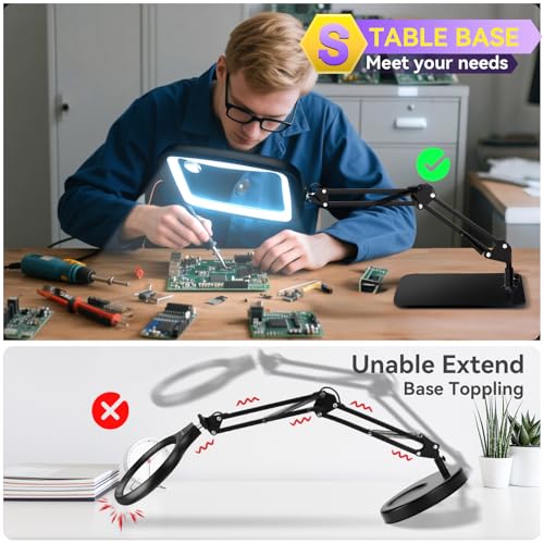 - 【Large Base to Stay Stable】 Features a large, sturdy, rounded rectangle base, without any risk of tilting or sliding. The flexible swivel swing arm allows you to easily position the angle and position of the lamp without rebound, allowing you to fully focus on complex tasks, hobbies, making, diamond painting, and sewing.