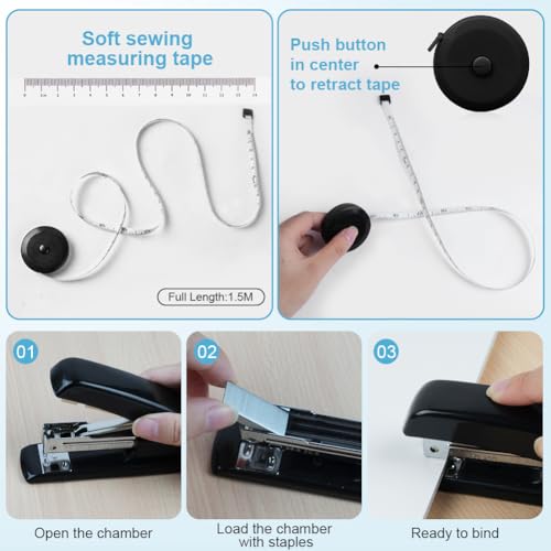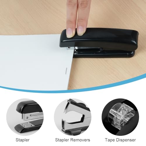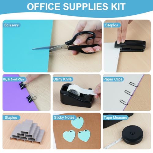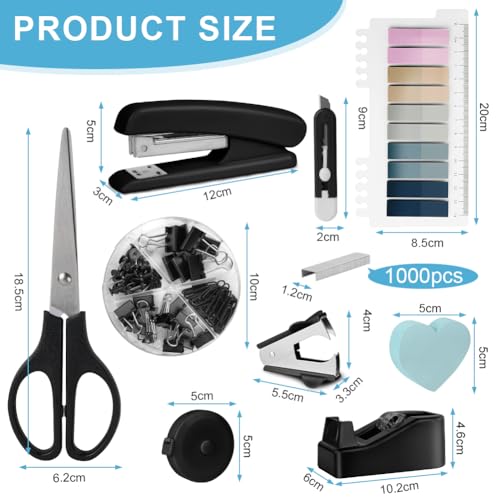 - 【Office Desk Accessories】This office desk accessory includes 1 stapler, 1 tape holder, 1 staple remover, 1 scissors, 1 ten-color sticky note, and 1 clip set (large and small clips, paper clips, pins ), 1 utility knife, 1 measuring tape, 1 love note and 1000 pieces of 24/6 staples. Such a complete desk accessory combination is enough to meet your school and office use needs.