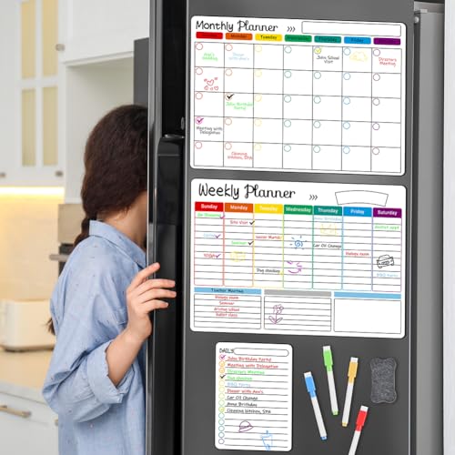 - 【Planner Set】The magnetic refrigerator whiteboard set includes a monthly planner whiteboard, a weekly planner whiteboard and a daily planner board. Accessories include 6 colored markers and 1 eraser.