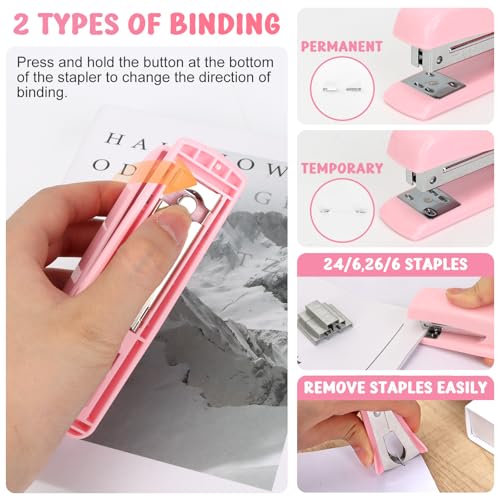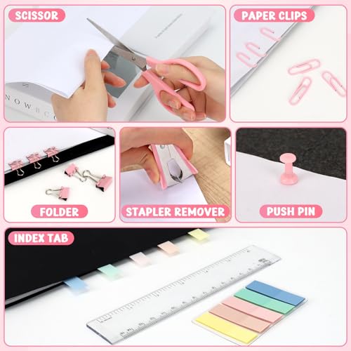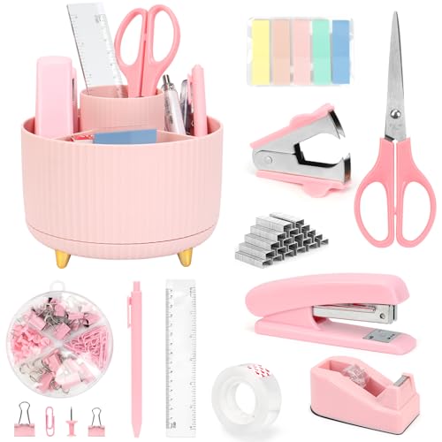 - [🗃️Office Supplies]Pink office stationary set including pen pot, stapler, stapler remover, tape dispenser, scissor, ruler, color memos, 1000pcs staples, 20 x push pins, 7 x big clips, 15 x small clips, 30 x paper clips,complete set, affordable and practical.