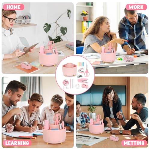 - [✂️High-quality Material]The pen pot, tape dispenser, stapler and stapler set, etc, which is made of high-quality material,crafted with carefully. Our pen pot features a 360 degree rotating function, there are 5 slots for you to organise and manage your items, making your desktop neat and tidy.