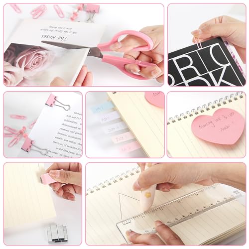 - Office Supplies Set: 1x pink stapler, 1x staple remover, 1000x staples, 1x mini stapler (with staples), 1 x tape holder, 2x transparent tape, 1x ruler, 1 x 0ffice scissor, 3 x clips, 10 x push pins, 1 box of paper clip, 5 colors sticky tabs, 1x love shaped sticky notes.