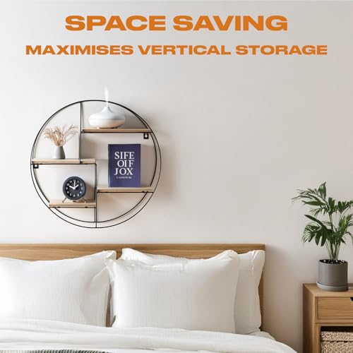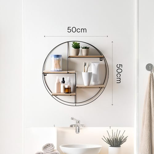 - 50cm x 50cm x 10cm – Circular shaped wall mounted shelf encases 4 wooded display shelves. Space-saving shelves for bedroom, living room, bathroom is ideal for small spaces. Shelf unit maximises vertical storage, keeping your essentials off the floor or countertops while adding visual interest to your walls.