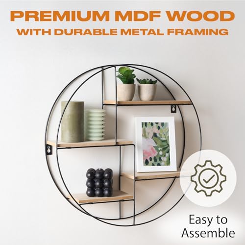 - Sturdy floating shelf set construction crafted from premium mdf wood display shelf and durable metal framing. Round floating shelf can safely support heavy items, perfect for displaying your favourite books, candles, plants, photos, and decor items.
