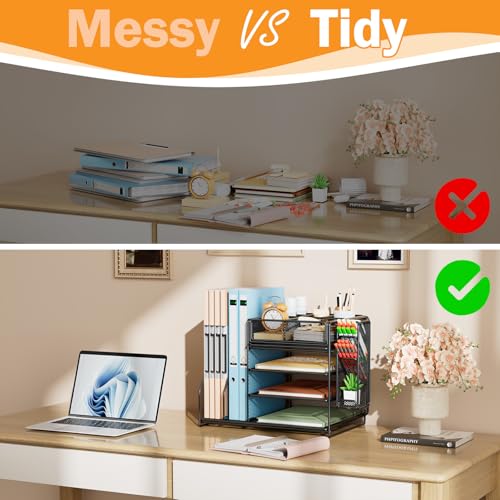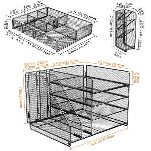 - 【Space Saving】Perfect size: 35.5*29.8*25.4cm. Vertical file holder can organise all office file folders. Paper tray organiser is perfect for storing books, magazines, letters and A4 paper. Drawer organiser and 4 compartments hanging pen holder are enough to hold all office accessories such as pens, pencils, scissors and more.