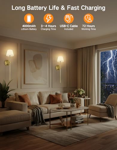 - 【Rechargeable & Long-Lasting Battery】Each sconce features a 4000mAh rechargeable battery that lasts up to 72 hours on low. Check battery levels anytime with the 3-stage LED indicator and recharge quickly via USB-C in just 3–4 hours.