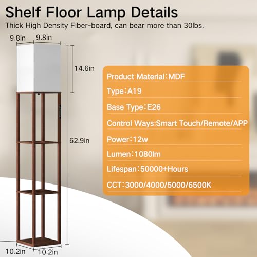 - Remote & Smart APP Control: OUTON floor lamp with shelves is equipped with a friendly remote control and a companion app, you can adjust the lighting settings from the comfort of your sofa. The remote allows you to change color modes and brightness levels (1%~100%), enabling you to select preferable light(Warm, Warm White, Cool White and Daylight White). The app connects via Bluetooth, experience the ease and flexibility of controlling your lighting with just a tap on your smartphone.