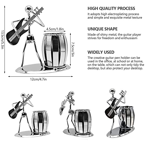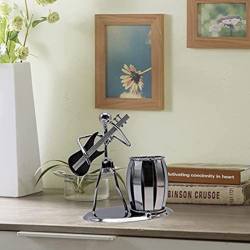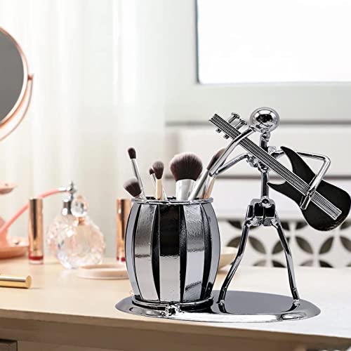 - 【Exquisite Design】: Desktop organizer featuring a barrel-shaped pencil holder next to a metal man playing an electric guitar. It's vintage style and metal guitar pen pot. Perfect for organizing small items on the desktop,it can save desktop space.