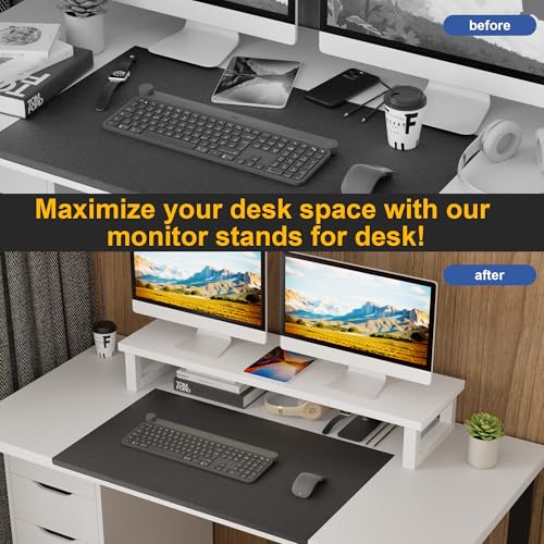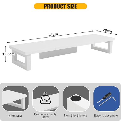 - 【Heavy-Duty Monitor Riser】 Engineered with 15mm industrial-grade MDF and reinforced steel legs, this monitor riser offers durability and stability for dual monitors. Waterproof and scratch-resistant, Size: 91x26x12.5 cm. Maximum load-bearing capacity: 110 lbs.
