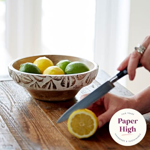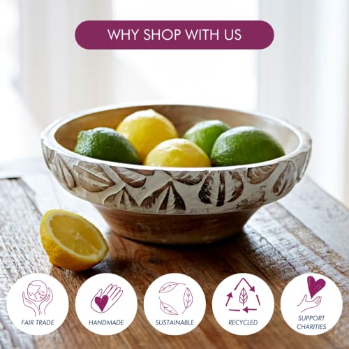 - Hand carved with an elegant leaf design, this mango wood bowl is painted in an antique white for a charmingly distressed finish.