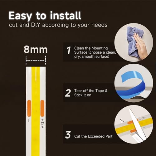 - 【Flexibility and Adaptability】 – This COB LED strip is flexible and can be formed into various shapes or patterns. It can be cut to the desired length for DIY projects (every 2.5 cm can be cut off without damaging the remaining strips).