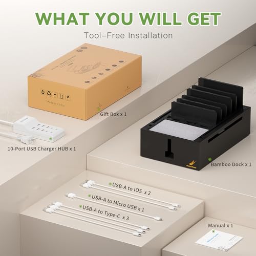 - What You Can Get: 1 x Pezin & Hulin Bamboo Charging Station, 1 x 10-Port USB Charger HUB & Cord, 6 x Short USB Cables (3pc Type-C, 2pc for lPhone & lPad, 1pc Android) for your daily use, 1 x user manual