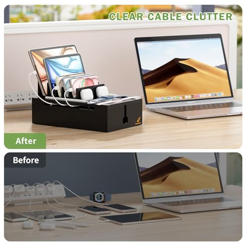 - Larger and Wider Base: The dock Station have a larger and wider base (Size 30 x 19 cm) sultable for a variety of power supplies. It can easily store the power strip and hide the cables for greater safety. Four anti-slip pads on the bottom increase the stability