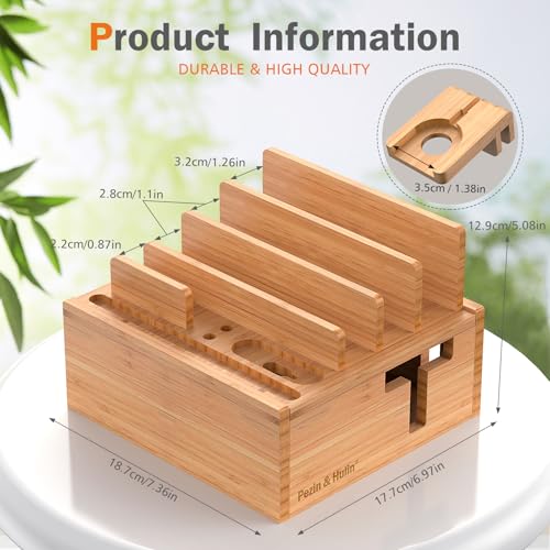 - Multi devices Charging Station: Pezin & Hulin bamboo charging station stand can hold up to 8 electronic devices such as cell phone, tablet, watch etc. Maintaining your devices in order and helps to clean up the stacking device charging