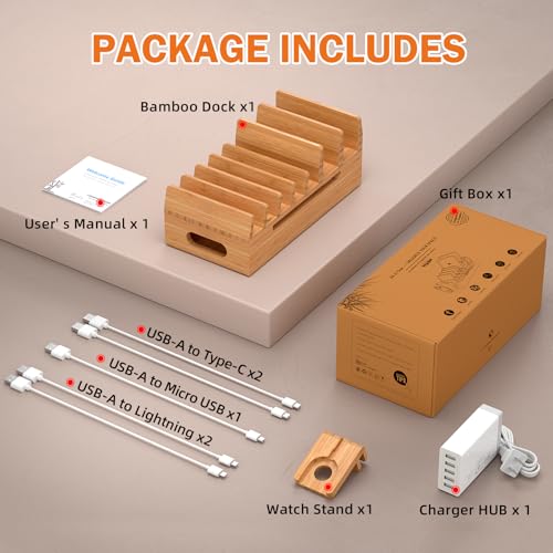 - Compatible with Multiple Devices: The bamboo charging station with Watch Dock Stand, is designed to charge up to your 7 devices simultaneously, matching to the universal cell phones, tablet, E-reader, and more devices no matter how thick case on