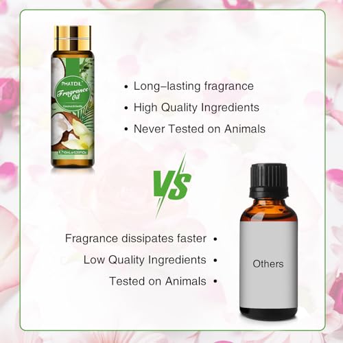 - Premium Grade Aromatherapy Oil: PHATOIL fragrance oil with a long lasting scent that pampers all your senses. Cruelty-free and never tested on animals. providing a safe and ethical choice for your aromatic journey. Immerse yourself in the captivating essence, drop by drop.