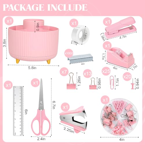 - Desk Organizers and Accessories Set – Pink office supplies set includes a variety of essential office items,1 x 360-degree rotating pen holders, 1 x staplers, 1 x staple removers, 1000 x staples, 1 x scissors,1 x rulers,1 x tape dispenser, binder clips & paper clips & push pins kit, 2 x tapes.This rich content make your workspace convenient and efficient.