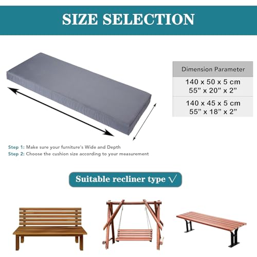 - Note : Seat Cushion Only, Furniture Not Included 3-Seater Sizes: Available in two new different sizes 140x50x 5cm and 140x45x 5cm. Perfect for a variety of outdoor garden furniture, including benches and swing seats.