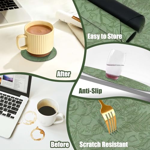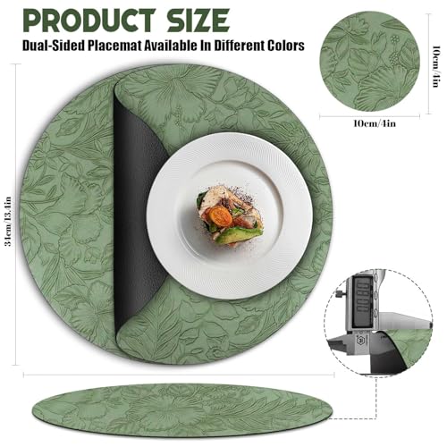 - 【HIGH QUALITY MATERIALS】The placemats and coaster sets 4 use premium eco-friendly faux leather material and rounded silhouette. These round place mats green, which differ from woven or fabric placemats, are water resistant to ensure spilled sauces or liquids don't pass through. So they can protect your dining table and give you a more enjoyable eating experience. Besides, edges of our thick leather place mats are nicely hemmed and reinforced to help to keep placemats from Fraying and Deforming.