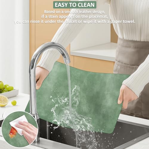 - LEATHER & COWHIDE GRAIN: These green placemats and coaster sets 6 are made of high-quality faux leather material and cowhide grain on both sides. The faux leather placemats have excellent toughness and abrasion resistance, which can effectively resist the wear and tear of daily tableware, and they can be used for a long time and remain beautiful. The cowhide texture of the table placemats reveals a natural and rustic aesthetic, giving them a premium visual quality.