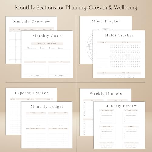 - 💛 WELLNESS TOOLS FOR EVERY MONTH Promote better wellbeing with dedicated pages for habit tracker, sleep logs, mood tracking, and weekly dinner planning. It’s not just a planner — it’s a self-care and habit tracker journal, ideal for building healthy routines. Whether you're after a happy planner, organiser notebook, or a daily journal, this format supports wellness and balance. Also works great for those needing a daily diary or creative diaries.