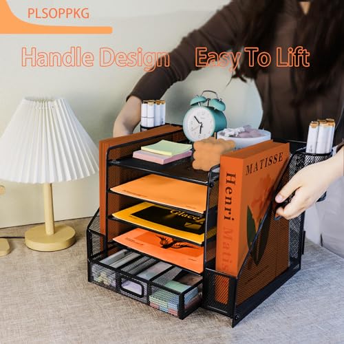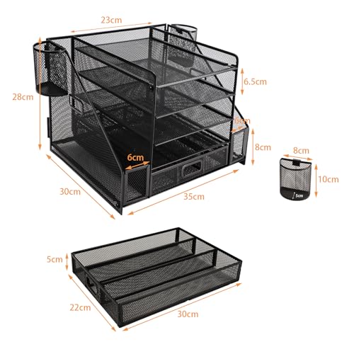 - 🥎【Multifunctional File Organiser】4 sliding trays+2 file holders+2 pen holders+1drawer. By organizing all office supplies comprehensively, our 9 in 1 file organizer is enough to complete the tidy of desktop documents and maximize the utilization of space