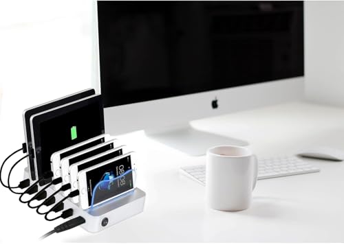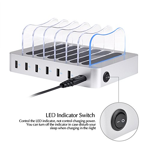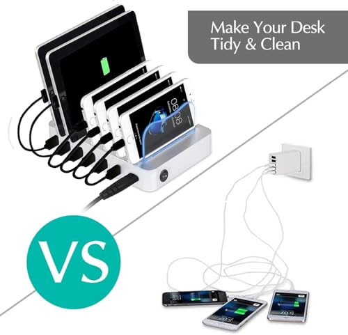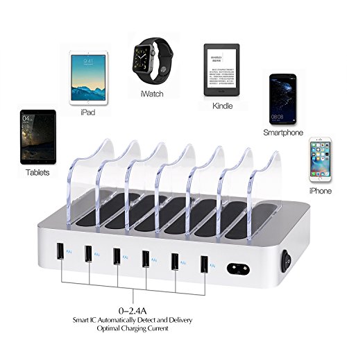 - SMART IC CORE & 6 USB PORTS — The USB charger station can charge for all USB-powered devices. Built-in intelligent chip can automatically detect and deliver demanded charging current (0-2.4A) for different devices, such as smart phone, tablets, power banks, e-Readers, Bluetooth speakers, headsets, MP3, MP4 and more.