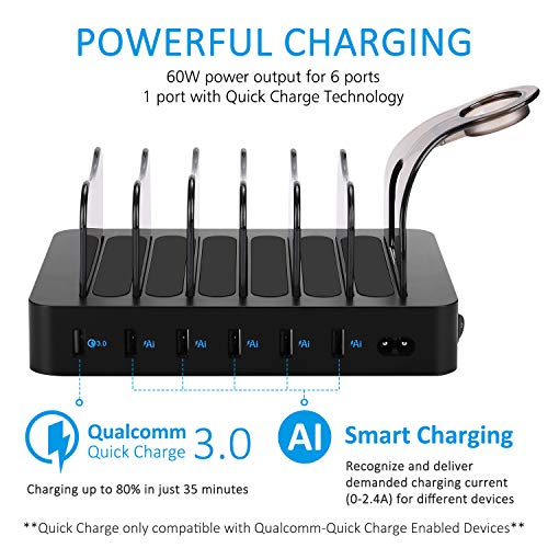 - Multiple Interface & Fast Charge — For the Ai USB ports, because of built-in intelligent chip, the output current automatically adjust between 0-2.4A, the USB port can automatically detect and deliver suitable charging current for different devices to maximize charging efficiency. For the QC3.0 port, it can charge up to 80% in 35 minutes, 4 times faster than the conventional charger.