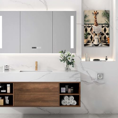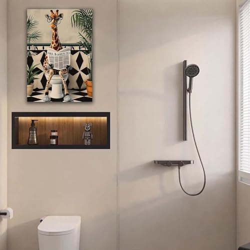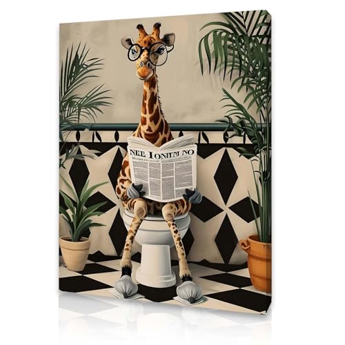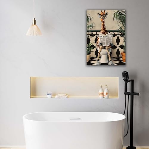- Playful Giraffe Bathroom Design Featuring a humorous giraffe reading on the toilet, this quirky framed canvas injects laughter and personality into your bathroom. A fun focal point that lightens the mood and makes an unforgettable impression on family and guests.