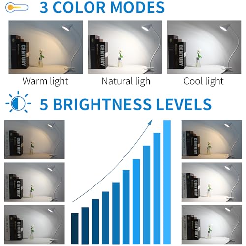 - COMFORTABLE LIGHTING SOURCES – This usb desk light has 3 color temperature (warm light, natural light and white light), each color has 5 brightness levels, so that the reading lamps clip on creates 15 illumination modes to meet your various lighting requirements.