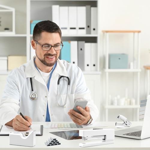 - QUALITY MATERIAL -Stapler and tape dispenser set made of high quality hard plastic and metal material,touch smooth and comfortable, sturdy and durable.The large White stapler can bind 50 pages at a time which is very suitable for office use.The uniform color White desk accessories design makes your desktop look neater and more comfortable.