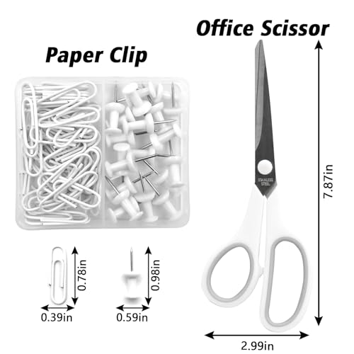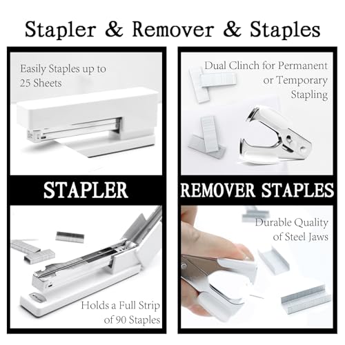 - PACKAGE INCLUDES – This White office supplies contains 1x 6.1inch Stapler , 1x Staple Remover, 1000x Staples, 1x Tape Dispenser, 1x Office Scissor, 20x Push pins, 40x Paper Clips, 10 colors Index Tabs. Such a complete White desk accessories combination can meet your daily office and study needs.