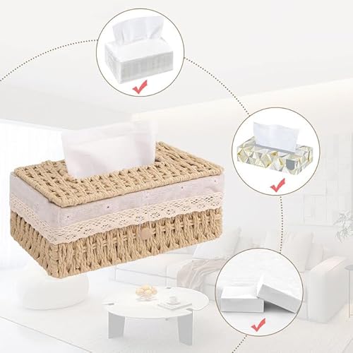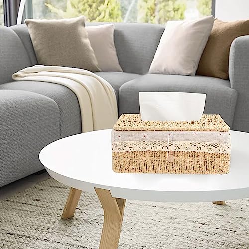 - High Quality Material:The tissue box holder is hand-woven with recycled paper rope, which is environmentally friendly and safe and the interior is attached by a rust-proof iron frame, which is durable and not easy to be deformed.
