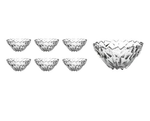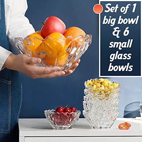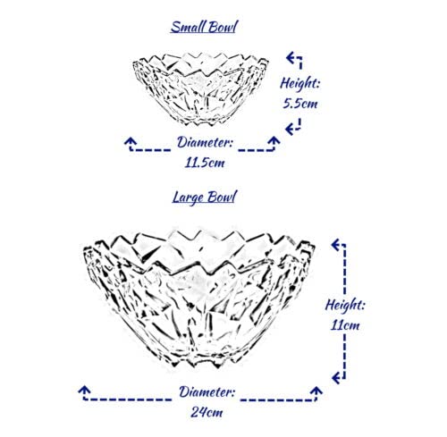- Dimensions & Versatile Use: This Reldor 7-piece set includes 6 small glass bowls (height 5.5 cm, diameter 11.5 cm) and 1 large fruit bowl (diameter 24 cm, height 11 cm). The small bowls are perfect for desserts, and ice cream, while the large fruit bowl is ideal for serving salads or trifle, making it a versatile addition to your kitchen.