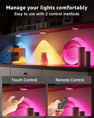 - 【Smart Dual-Control Lighting with Custom Timer ⏰】 These under cabinet puck lights offer exceptional 2 control options to optimize your lighting experience. Effortlessly adjust color, brightness, and timer settings using the included remote. For quick manual control: a short touch handles on/off and color cycling, while a long press enables smooth brightness adjustments. Choose from 5 brightness levels or set auto-off timers (30-60mins), making it easy to fully customize your lighting.