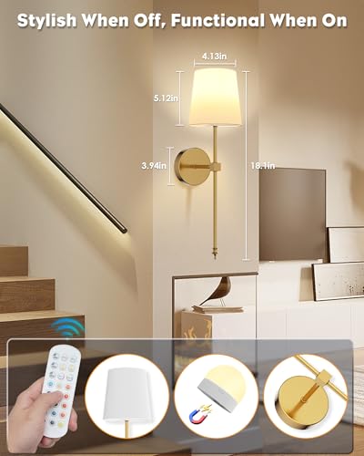 - 💡【COMBINING AESTHETICS & PRACTICALITY】Battery wall lights indoors perfectly fit your lighting, ambiance, and decor needs! Showcasing its minimalist and stylish appearance by day, and transforming into a practical lighting master by night. Battery-powered wall lights feature a gold metal frame, handcrafted white shade, and upgraded RGB bulb, with a maximum brightness of 500 lumens. Choose from cool white, natural white, warm white, and 12 RGB color options.
