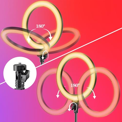 - Angle-adjustable Ring Light: You could adjustable the ring light angle with the mount on top of the tripod stand as you need. You could adjustable the light angle up and down, right and left, the light can be faced down to the floor if you need
