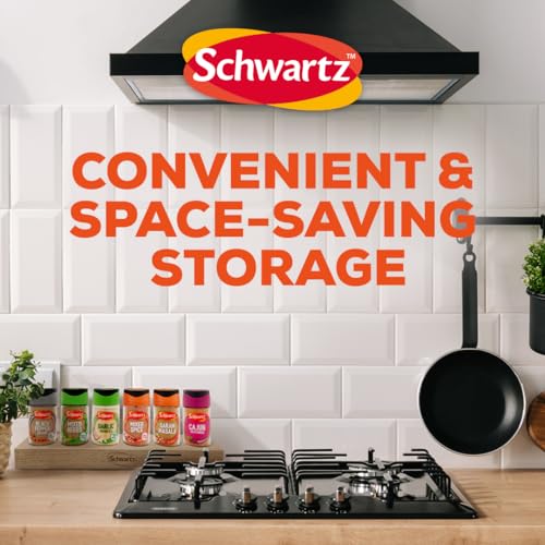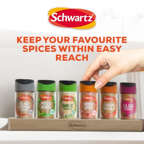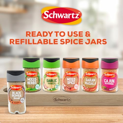 - READY TO USE & REFILLABLE SPICE JARS: Includes 6 pre-filled glass spice jars: Black Pepper Ground, Mixed Herbs, Garlic Granules, Mixed Spice, Garam Masala, and Cajun Seasoning. Once jars run out, they can easily be refilled with any Schwartz spice jars, keeping your most-used seasonings, spices and herbs readily available for all your culinary needs. Schwartz spices are known for their rich flavour profiles, making them a must-have for bringing vibrant colour and bold taste to your favourite dishes.