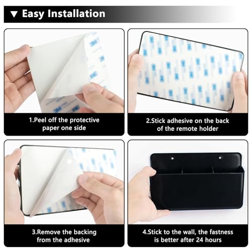 - 【Easy Installation】Wall remote holder with strong double-sided tape on the back can be easily stuck to the positioned places. First stick the tape on the wall, then stick the remote control box on the tape for 24 hours before putting other items in; Do not place heavy objects immediately after pasting