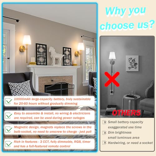 - Sconces Wall Decor Set Of 2, Easy Wireless Installation: Battery operated wall light do not require wiring and electricians, contains all accessories and installation instructions, can be quickly and easily installed anywhere, no need to worry about sockets. The wireless wall sconce is suitable for old houses, rental houses or any dark corners that cannot be wired but need lighting.