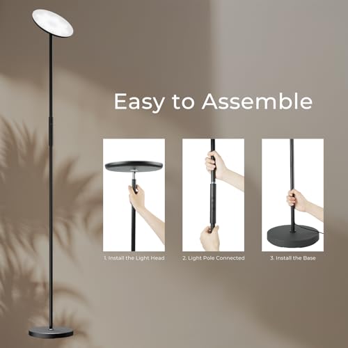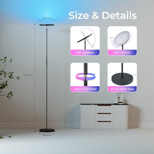 - Adjustable Lamp Head: With remarkable 36W and 2800 lumens, this living room lamp is bright enough to light up your whole room and is gentle on the eyes. The 69.3in height avoids staring at the light directly. The head of the dimmable stand up lamp supports 350° rotation and 180° up/down flipping. Whether as a torchiere floor lamp or reading floor lamp, it can provide you with the best lighting experience