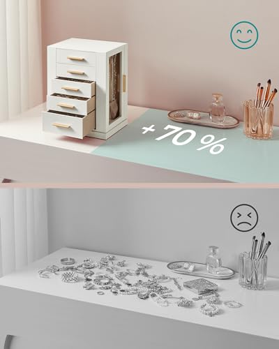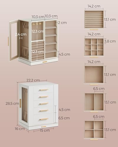 - [Spacious Meets Versatile] This 16 x 22.2 x 28.5 cm jewellery box is designed with ring slots, necklace hooks, stud earring holes, 5 drawers for brooches and hair accessories, and 18 necklace hooks. It provides convenient storage for all jewellery